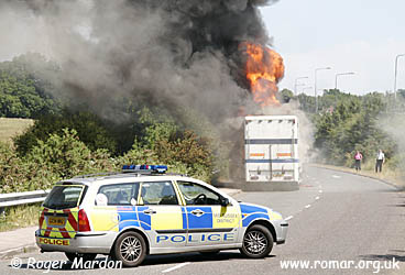 On 2nd July 2006, while travelling to the Amberley Chalk Pits fire engine rally, I came across this horse box well alight on the A272 at Bolney, West Sussex. The police had already closed the road.