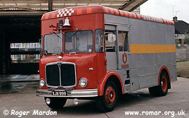 Reading’s Dee Road (Tilehurst) fire station operated this 1961 AEC Mercury / Carmichael special unit, XJB 999, which combined the functions of an emergency/salvage tender and control unit. It was photographed at Dee Road, Reading in 1974.